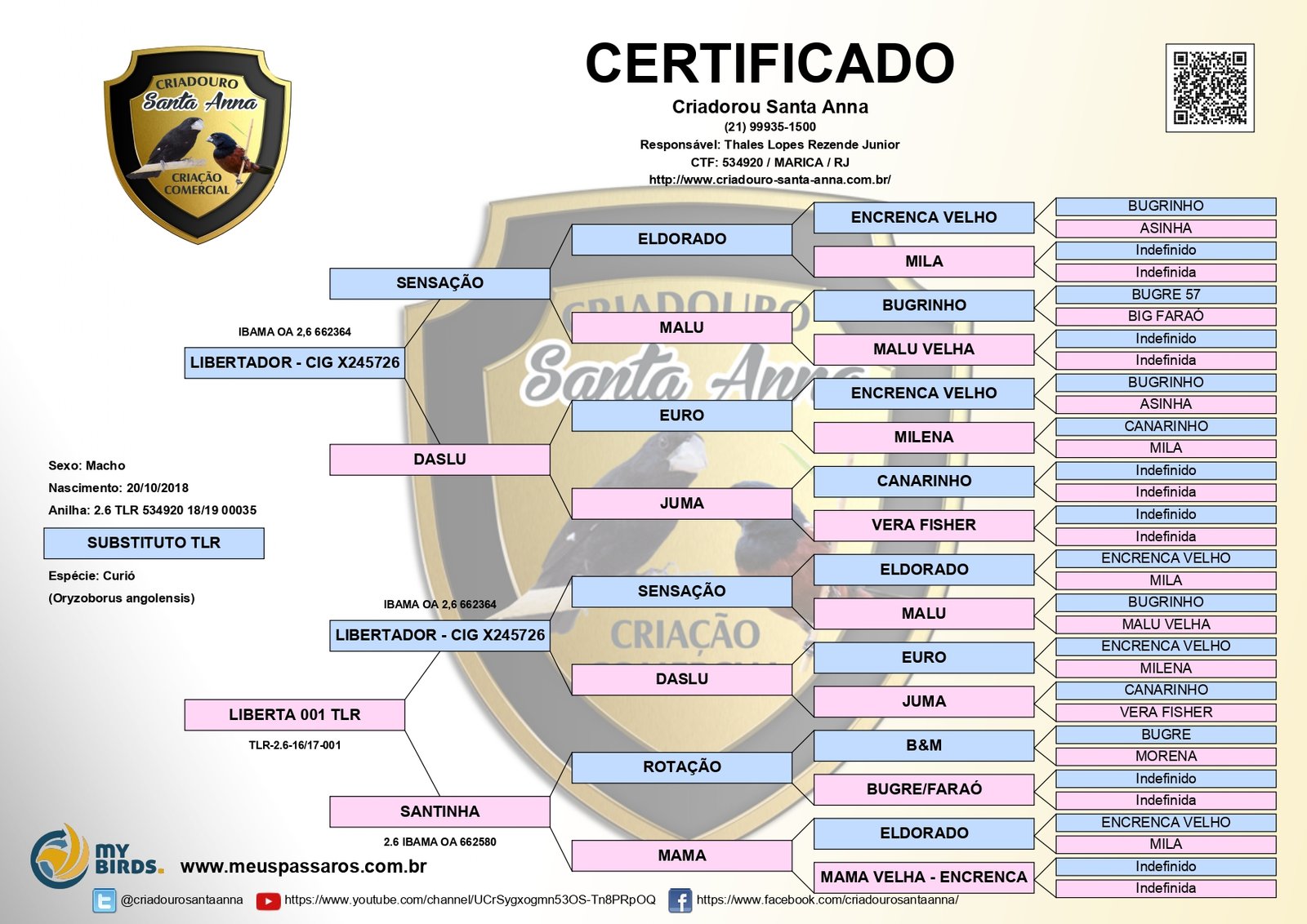 O SUBSTITUTO TLR e um filho F2 do LIBERTADOR que foi um curió fora de serie, crônico nunca esfriava, o maior reprodutor que eu já vi, tirou centenas de filhos, deixou muitas saudades, além de ter uma genética fechadíssima na raça encrenca, ele era muito repetidor chegando fácil aos 2 minutos de canto na cara de seus oponentes e com uma bitola de canto que se ouvia do outro lado da roda, ele foi tirado pelo amigo Ezio de Mato Grosso .